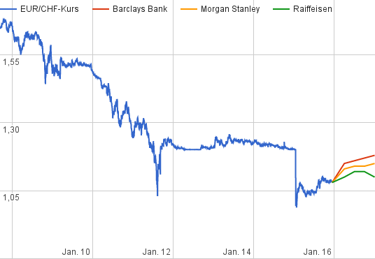 Während die Banken aus dem angelsächsischen Raum erhebliches Kurspotenzial für den Euro sehen, bleiben die heimischen Geldinstitute vorsichtig. Die Raiffeisen Zentralbank sieht den Euro bis Mitte 2016 auf 1,12 Franken und steigen und bis Ende 2016 auf 1,10 Franken fallen. Die St.Galler Kantonalbank prognostiziert für die kommenden zwölf Monate einen durchschnittlichen Eurokurs von 1,10 Franken.