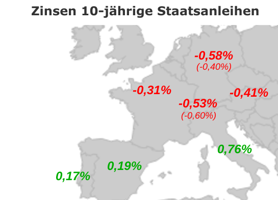 Vor einem Jahr lagen die Zinssätze bei -0,40% (Deutschland) und -0,60% (Schweiz). Der Zinsnachteil der Schweiz gegenüber Deutschland war ein wichtiger Grund, warum der Euro seinerzeit mit 1,10 Franken recht hoch stand.