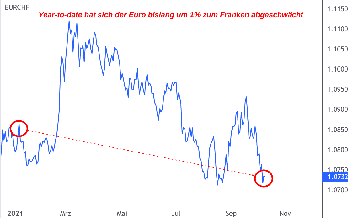 In der Eurozone klettert die Inflation auf 3,4%. Der wirtschaftlichen Entwicklung fehlt es an Dynamik. Einkaufsmanager-Daten und Konjunkturerwartungen sind im Schnitt eine Stufe schlechter als in der Schweiz. Die Europäische Zentralbank (EZB) prüfe ein weiteres, massives Staatsanleihenkaufprogramm, meldete Bloomberg am Mittwoch. Es soll die pandemiededingten Staatsanleihenkäufe, die nächstes Jahr auslaufen, ersetzen.