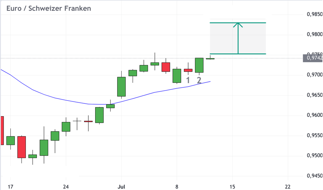 Die einen Anstieg des Euro anzeigende ruhige, bullische Flagge setzt sich gegen das den Schweizer Franken favorisierende Tiefere Hoch (TH) durch.